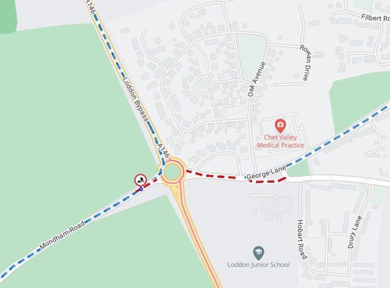 Road A: A146, Norwich Rd, Loddon Rd, B1332 Bungay Rd, The Street, Hunstead Lane, Brooke Rd, Loddon Rd, Mundham Rd